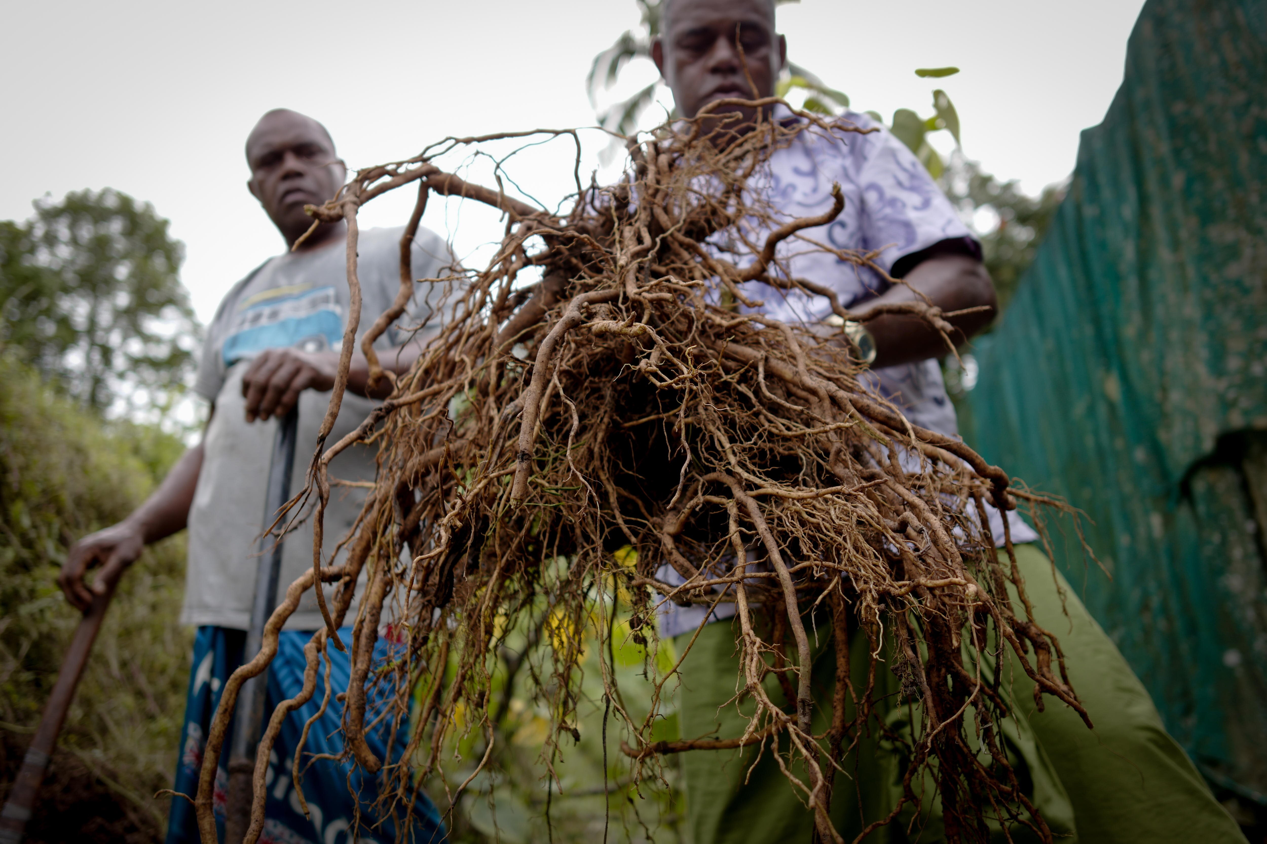 Aleveo and his workers dig up a three-year-old plant to reveal its root system — the fibrous threads that will be processed into powder and, hopefully, exported across the world.
