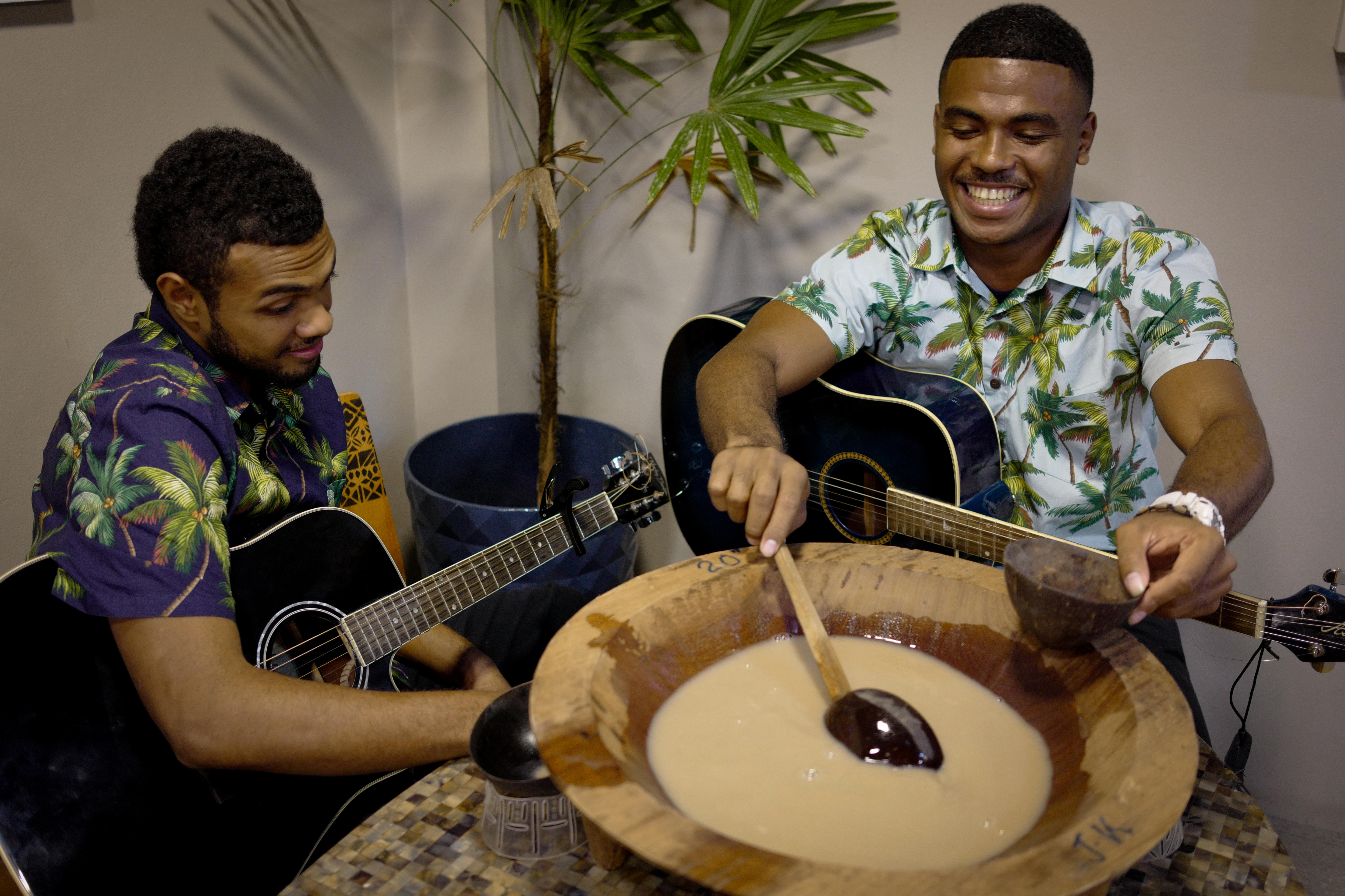 The band in the corner is taking breaks only to down a bowl of kava, with one member insisting the drink "makes you happy".
