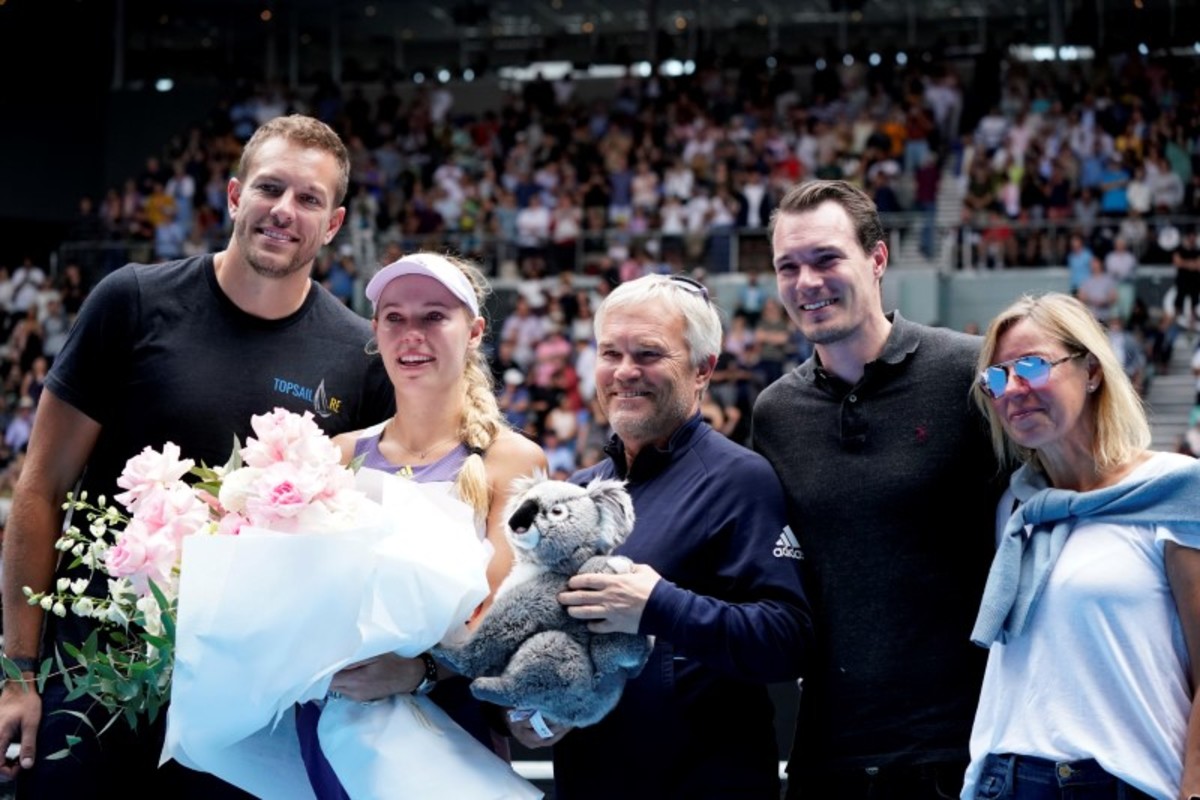 Tennis - Australian Open - Third Round - Melbourne Park, Melbourne, Australia - January 24, 2020 - Denmark’s Caroline Wozniacki poses for pictures with her husband David Lee, coach and father Piotr Wozniacki, mother Anna Wozniacki and brother Patrik Wozniacki, as she heads into retirement after losing the match against Tunisia’s Ons Jabeur. REUTERS/Kim Hong-Ji