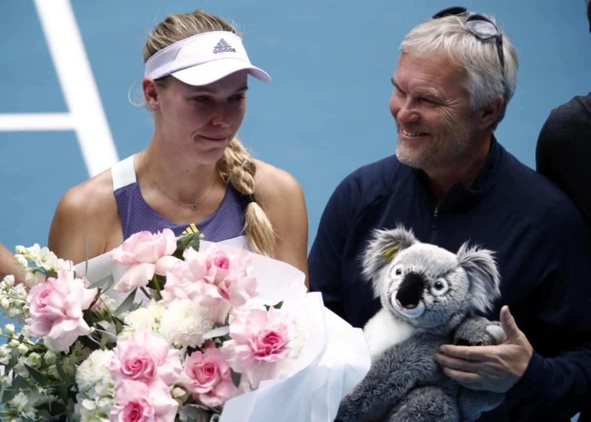 Tennis - Australian Open - Third Round - Melbourne Park, Melbourne, Australia - January 24, 2020 - Denmark’s Caroline Wozniacki holds flowers next to her coach and father Piotr Wozniacki as she heads into retirement after losing the match against Tunisia’s Ons Jabeur. REUTERS/Edgar Su