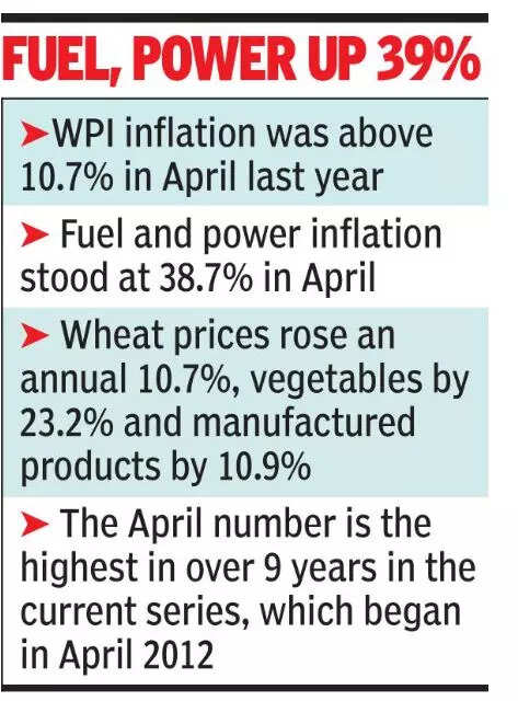 The WPI data showed fuel and power inflation at 38.7% in April. Wheat prices rose an annual 10.7%, vegetables by 23.2%, manufactured products by 10.9%, highlighting the price pressures across the board.