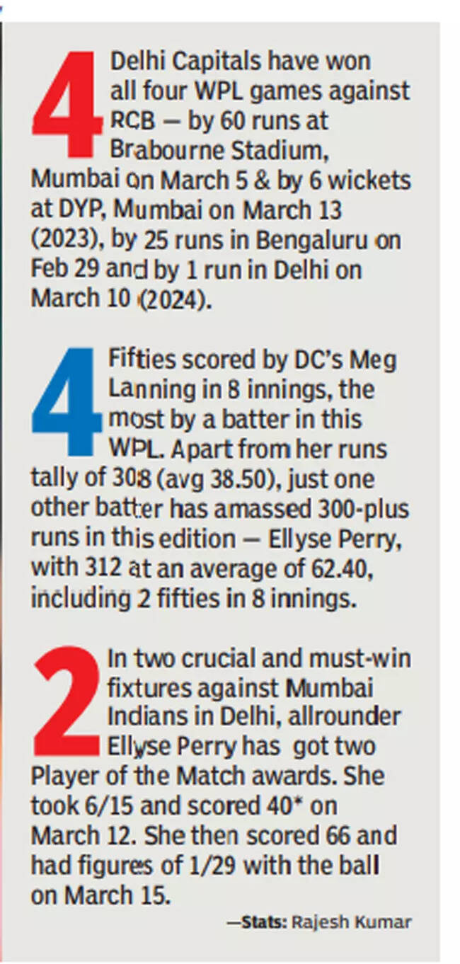 DC, who were runners-up in 2023, finished on top after the league phase with some dominating performances this season. Besides form, the head-to-head between the two teams also favours the Capitals. They have come out on top in all four meetings against RCB over the two editions of WPL. DC’s strength lies in their batting, with the explosive opening pair of skipper Lanning and Shafali Verma leading the way.