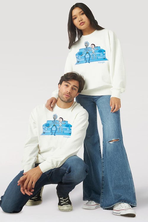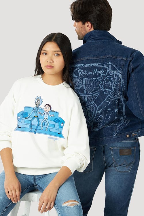 While the next installment between Wrangler and Rick and Morty doesn’t nod to any particular episode, it puts the show’s namesake characters into typical settings. A white sweatshirt sees Rick and Morty sitting on a patchwork denim couch — dressed in Canadian tuxedos — most likely watching interdimensional cable. Matching blue Wrangler branding appears underneath the graphic.