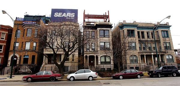 Addison & Clark's developers acquired a long row of low-slung brick buildings on Clark and demolished them to make way for the big mixed-use complex.