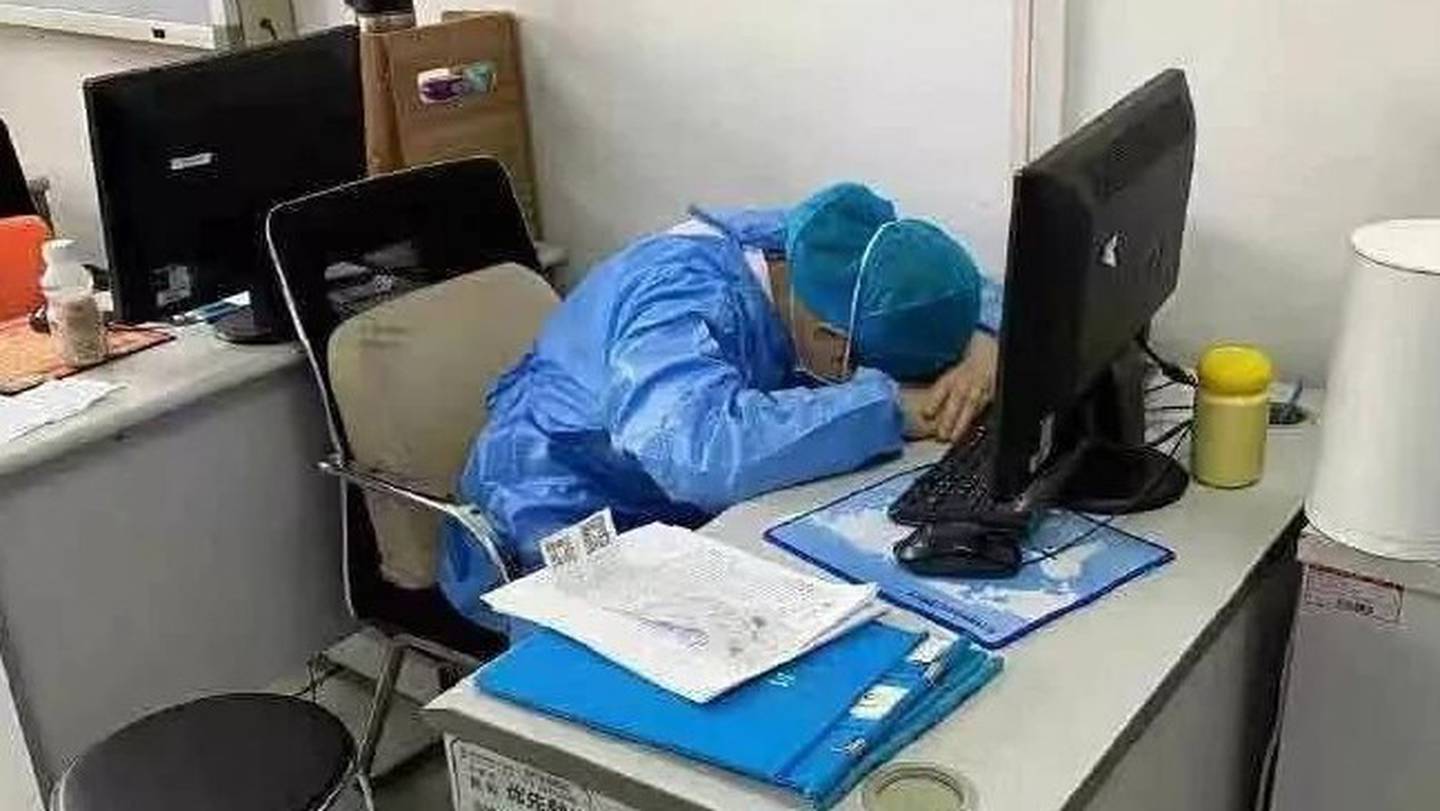 Photos shared on state-owned media showed tired medics slumped over desks and sleeping on floors of unnamed hospitals, still dressed in their protective clothing.