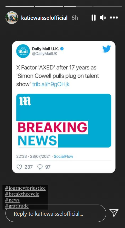 Former contestant Katie Waissel also shared a Daily Mail article about it on her Instagram stories, with the hashtags #journeyforjustice #breakthecycle #news #gratitude.