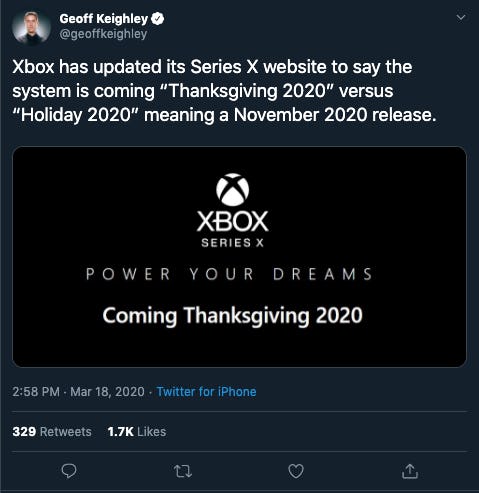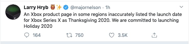 “An Xbox product page in some regions inaccurately listed the launch date for Xbox Series X as Thanksgiving 2020,” he tweeted. “We are committed to launching Holiday 2020.”