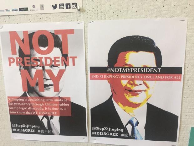The posters initially appeared in several universities across the US after a Twitter account, @StopXiJinping, posted links encouraging people to download the posters.