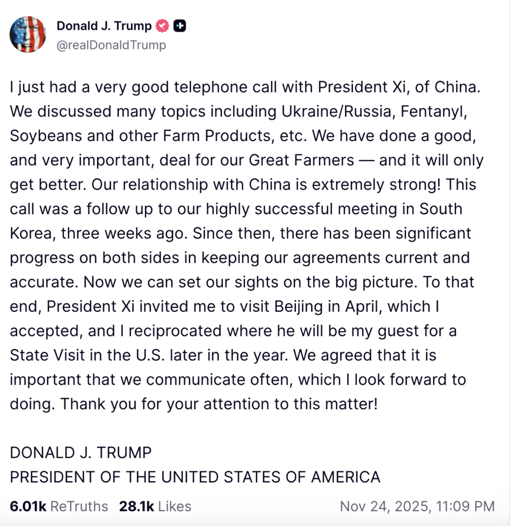 He highlighted that the conversation was a follow-up to the South Korea meeting, adding, "Our relationship with China is extremely strong! … We agreed that it is important that we communicate often, which I look forward to doing."