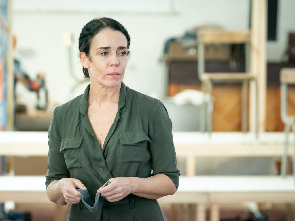 “It’s intense,” says Farber when I ask her to describe the atmosphere on her sets. “It’s not some crazy cult!” she assures me. “But it is very hermetically sealed off.” Typically, Farber reiterates, hers is an intense set. But as with everything during a pandemic, anything typical quickly fell away. Two positive tests demanded pauses in production. For safety reasons, a ventilator constantly droned in the rehearsal room. Here Farber mimics its annoying buzzing noise. And the door had to remain open. Farber’s “hermetic seal” was broken: a defunct pressure cooker hissing out artistic steam. Luckily though, “somehow we managed to hold on to the stakes to tell a story of this intensity and gravitas”.