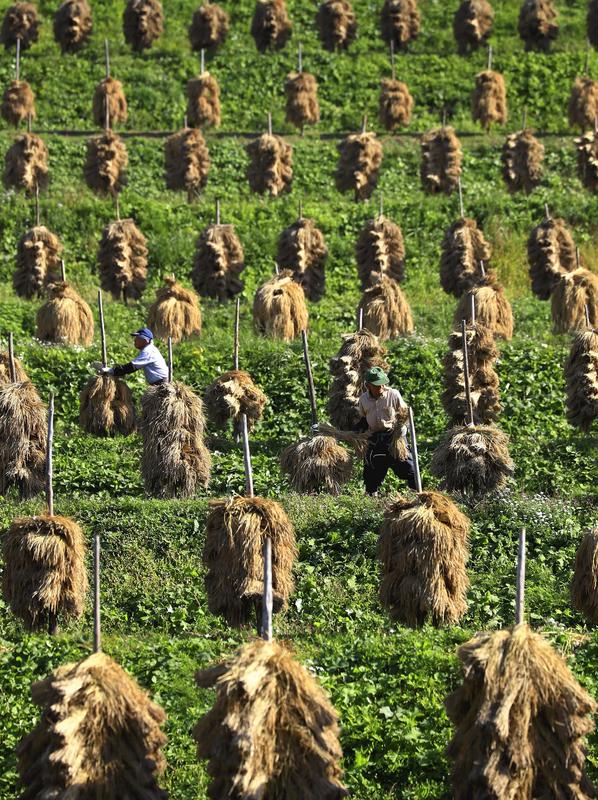 Farmers place bundles of rice stalks on rows of poles to dry in the sun on the rice terrace known as "Owarabi no tanada" in Yamanobe, Yamagata Prefecture, on Monday. This traditional method of sun drying, called "kuikake," dates back to the Edo period (1603-1867). Over 1,000 upright wooden poles, each about 2 meters high, stand in neat rows.