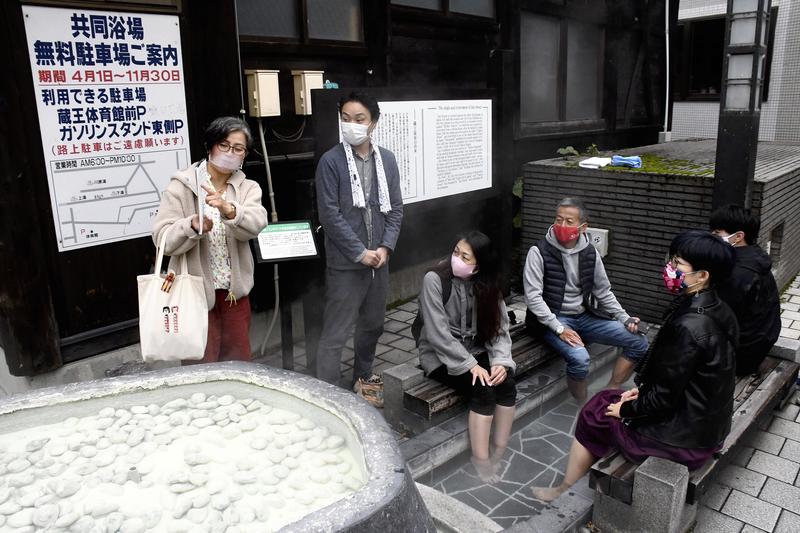 As the tour participants dipped their feet in a communal footbath and warmed their hands in small handbaths on Takayu-dori street in the center of Zao Onsen, Ito detailed the unique qualities of the water in the springs. A university employee from Yamagata who is a frequent visitor to Zao Onsen was amazed by Ito's depth of knowledge. "I didn't know the water here was so acidic. That impressed me," he said.