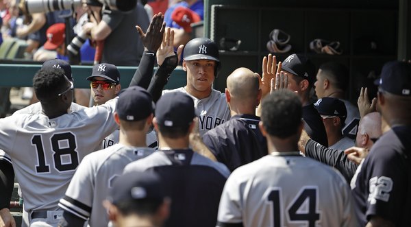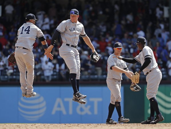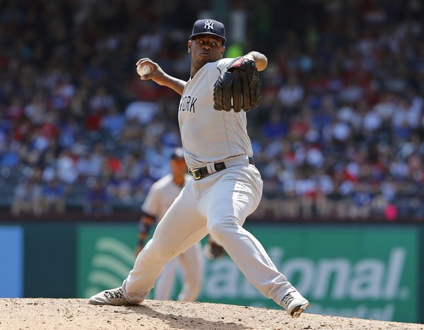 An offense that slumbered pretty much all afternoon eventually scratched out enough to give the Yankees a 3-1 victory over the Rangers in front of 38,135 at Globe Life Park, a victory in which Aroldis Chapman, reinstated as the closer, earned the save.