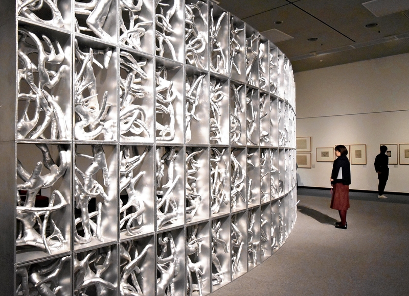 In the exhibition "The collection of Yayoi Kusama + Artists who went to America," 85 of Kusama's works from the museum are on display. They include a large 8.4-meter-wide piece titled "Shooting Stars" and an etching on corroded copperplate jointly made with Kihachi Kimura (1934-2014), a printmaker from Minami-Uonuma, Niigata Prefecture.