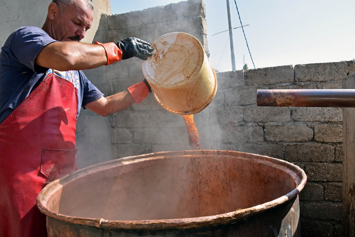 Hussein fills vast blue vats with dates, adds water and pulps the sweet fruit. He then places the mixture in a sealed pot and heats it to distil the alcohol.