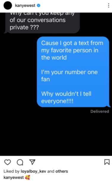 “U are creating a dangerous and scary environment and someone will hurt Pete and this will all be your fault,” Kardashian wrote in a text that Ye screenshotted and posted online. In the caption he wrote, “Please nobody do anything physical to Skete, I’m going to handle the situation myself.” (The second slide of the post showed a still from the film Baby Boy, of Ving Rhames putting Tyrese in a chokehold.) In another screenshotted text, Kim asked, “Why can’t you keep any of our conversations private ???” To which Ye responded, “Cause I got a text from my favorite person in the world. I’m your number one fan. Why wouldn’t I tell everyone!!!!”