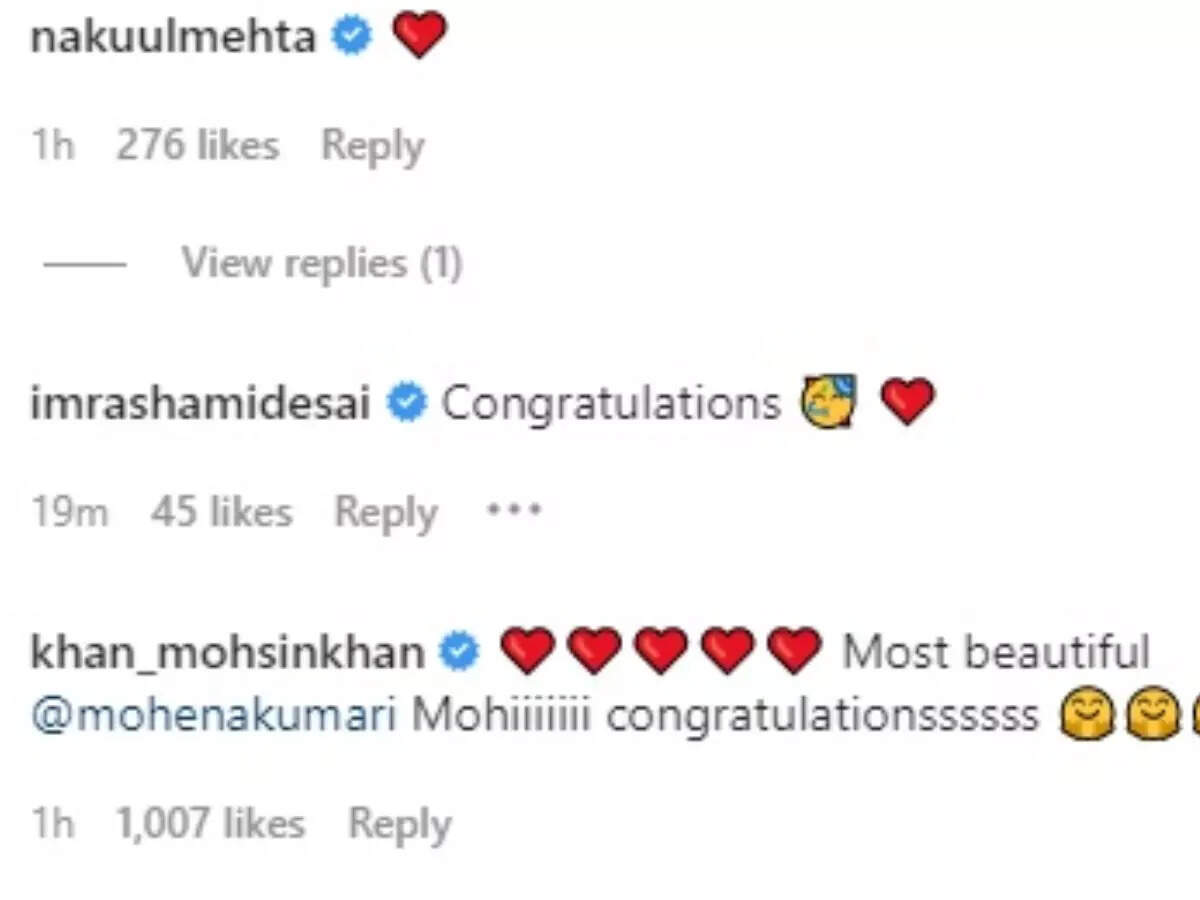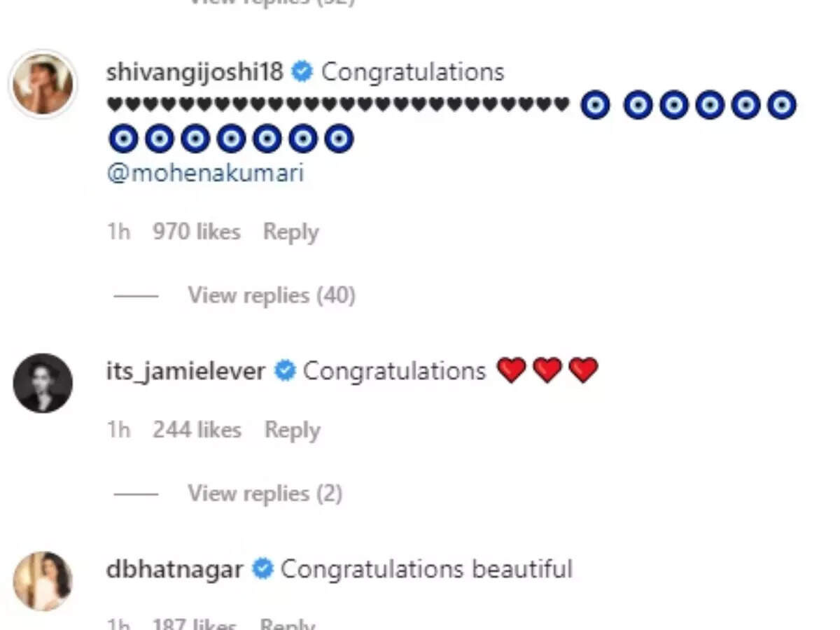Mohena's friends from the industry, Nakuul Mehta, Shivangi Joshi, Mohsin Khan, Jamie Lever and many others congratulated her.