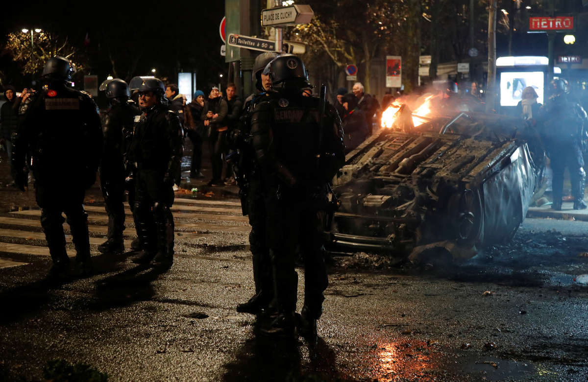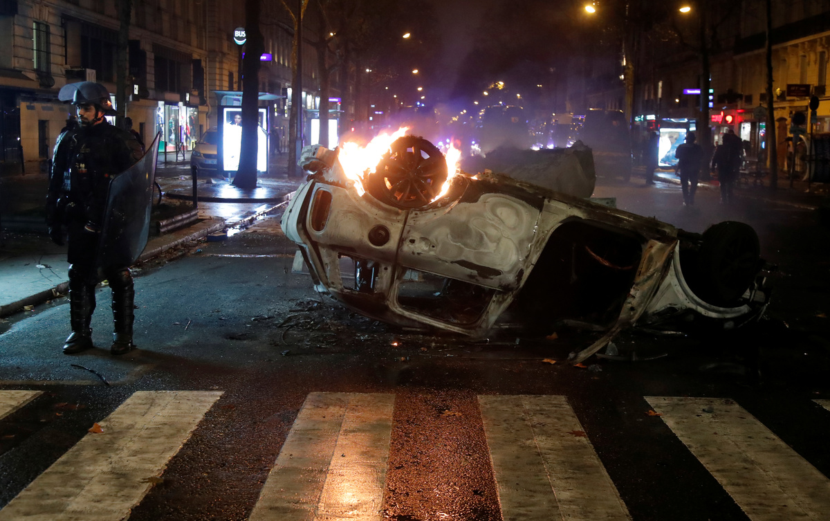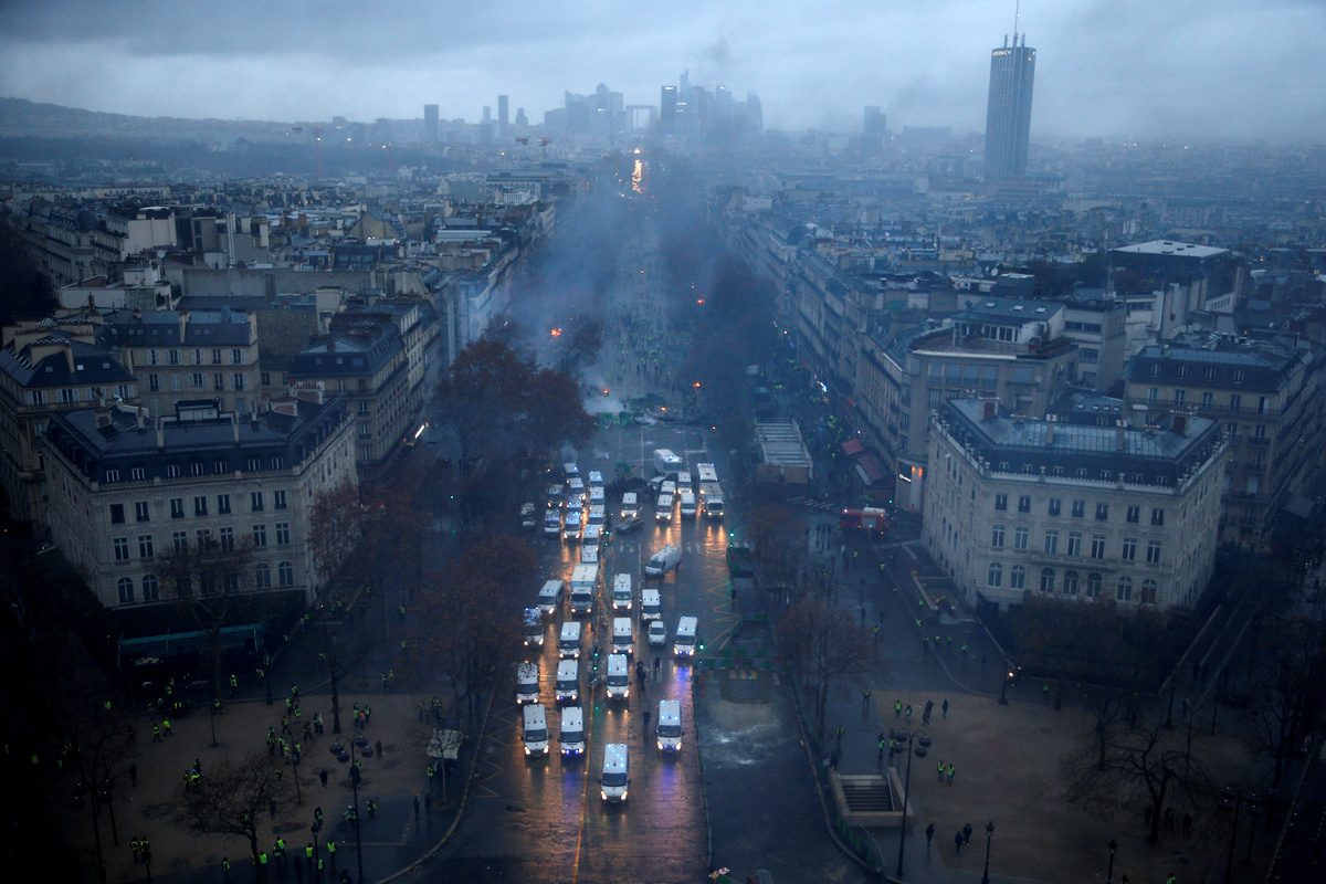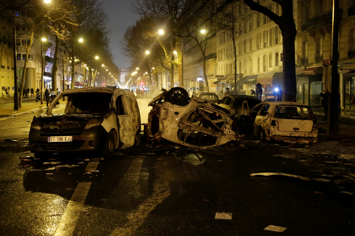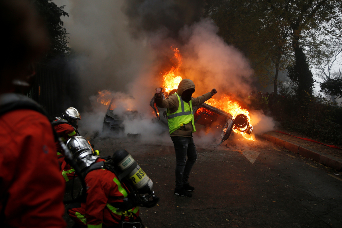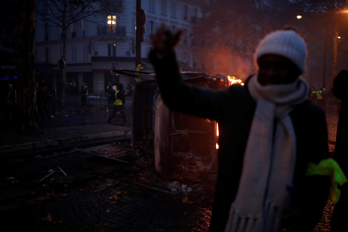 Firemen extinguish burning cars set afire by protesters wearing yellow vests, a symbol of a French drivers' protest against higher diesel fuel taxes, during clashes near the Place de l'Etoile in Paris, France, December 1, 2018. REUTERS/Stephane MaheA general view shows police forces and protesters wearing yellow vests, a symbol of a French drivers' protest against higher diesel taxes, during clashes as part of a demonstration near the Place de l'Etoile in Paris, France, December 1, 2018. REUTERS/Stephane MaheFrench police forces secure the Trocadero place near the Eiffel tower during a demonstration by protesters wearing yellow vests, a symbol of a French drivers' protest against higher diesel fuel taxes, in Paris, France, December 1, 2018. REUTERS/Stephane MaheA protester wearing yellow vest, a symbol of a French drivers' protest against higher diesel taxes, stand near a burning car during clashes in a street near the Place de l'Etoile in Paris, France, December 1, 2018. REUTERS/Benoit TessierFiremen extinguish burning cars set afire by protesters wearing yellow vests, a symbol of a French drivers' protest against higher diesel fuel taxes, during clashes near the Place de l'Etoile in Paris, France, December 1, 2018. REUTERS/Stephane MaheAn overturned car is seen in a street near the Place de l'Etoile after clashes with protesters wearing yellow vests, a symbol of a French drivers' protest against higher diesel taxes, in Paris, France, December 1, 2018. REUTERS/Benoit TessierFrench riot police stand guard in a street near the Place de l'Etoile during clashes with protesters wearing yellow vests, a symbol of a French drivers' protest against higher diesel taxes, in Paris, France, December 1, 2018. REUTERS/Benoit TessierFiremen extinguish burning cars set afire by protesters wearing yellow vests, a symbol of a French drivers' protest against higher diesel fuel taxes, during clashes near the Place de l'Etoile in Paris, France, December 1, 2018. REUTERS/Stephane MaheResuce workers treat an injured individual near protesters wearing yellow vests, a symbol of a French drivers' protest against higher diesel taxes, on the rue du Rivoli in Paris, France, December 1, 2018. REUTERS/Charles PlatiauFiremen extinguish burning cars set afire by protesters wearing yellow vests, a symbol of a French drivers' protest against higher diesel fuel taxes, during clashes near the Place de l'Etoile in Paris, France, December 1, 2018. REUTERS/Stephane MaheProtesters wearing yellow vests, a symbol of a French drivers' protest against higher diesel fuel taxes, gather near a burning car during clashes near the Place de l'Etoile in Paris, France, December 1, 2018. REUTERS/Stephane MaheA French flag is held by protesters wearing yellow vests, a symbol of a drivers' protest against higher diesel taxes, demonstrate near the Place de l'Etoile in Paris, France, December 1, 2018. REUTERS/Stephane MaheA protester wearing a yellow vest, a symbol of a French drivers' protest against higher diesel fuel taxes, stands near a burning car during clashes near the Place de l'Etoile in Paris, France, December 1, 2018. REUTERS/Stephane MaheTear gas fills the air as a protester wearing a yellow vest, a symbol of a French drivers' protest against higher diesel taxes, demonstrates near the Place de l'Etoile in Paris, France, December 1, 2018. REUTERS/Stephane MaheA protester wearing a yellow vest, a symbol of a French drivers' protest against higher diesel taxes, stands near a burning car during clashes near the Place de l'Etoile in Paris, France, December 1, 2018. REUTERS/Stephane MaheA view shows police forces and protesters wearing yellow vests, a symbol of a French drivers' protest against higher diesel taxes, during clashes as part of a demonstration near the Place de l'Etoile in Paris, France, December 1, 2018. REUTERS/Stephane MaheProtesters wearing yellow vests, a symbol of a French drivers' protest against higher diesel taxes, demonstrate near the Place de l'Etoile in Paris, France, December 1, 2018. REUTERS/Stephane Mahe