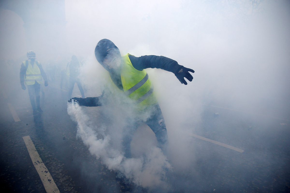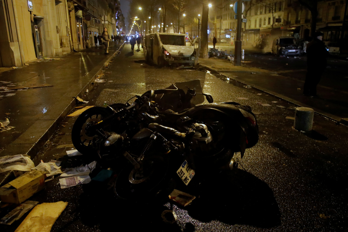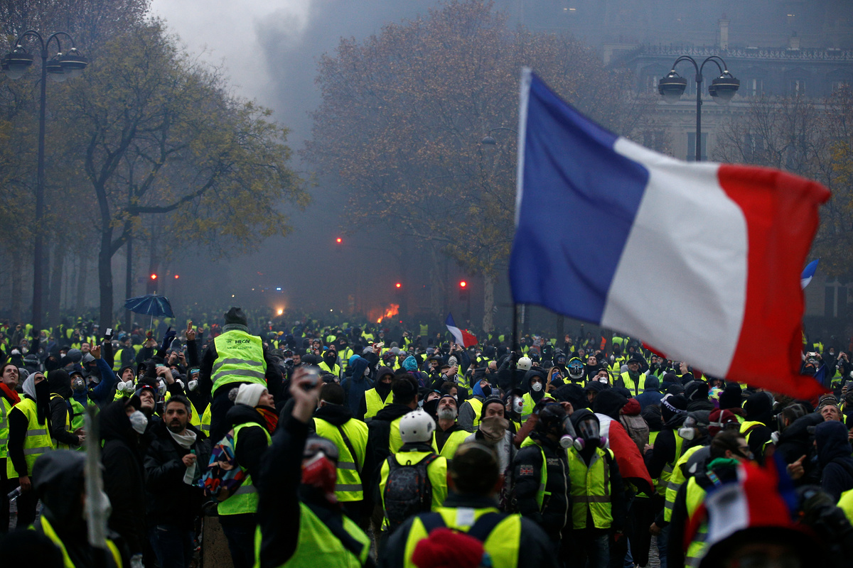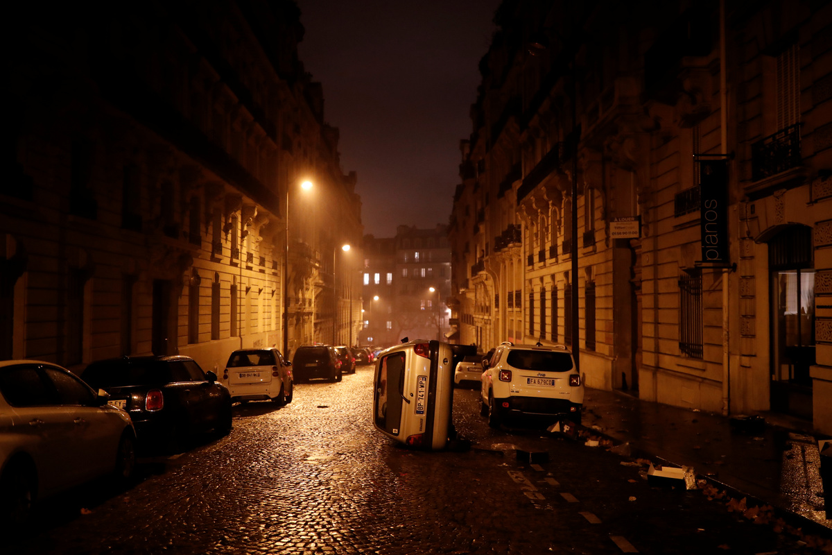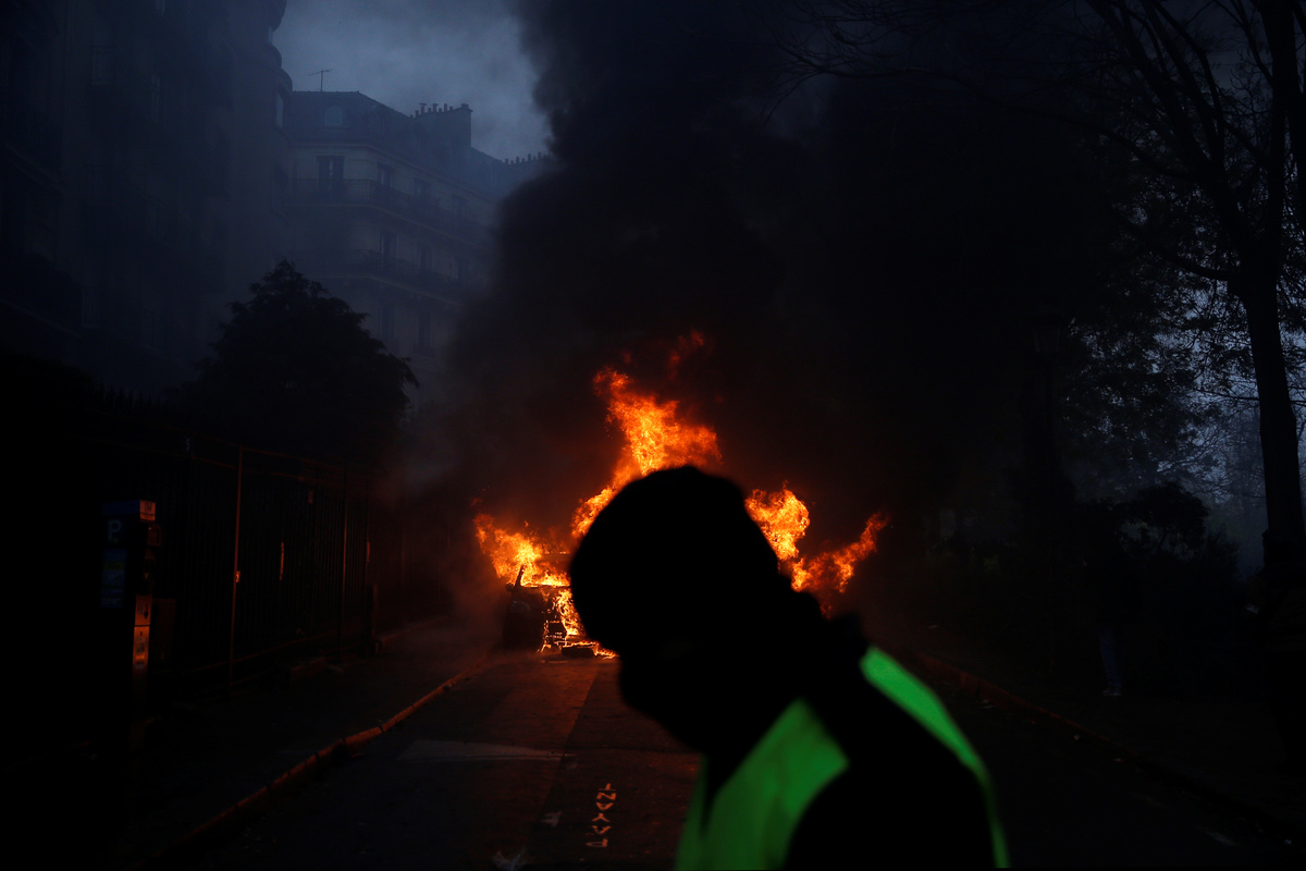 Firemen extinguish burning cars set afire by protesters wearing yellow vests, a symbol of a French drivers' protest against higher diesel fuel taxes, during clashes near the Place de l'Etoile in Paris, France, December 1, 2018. REUTERS/Stephane MaheA general view shows police forces and protesters wearing yellow vests, a symbol of a French drivers' protest against higher diesel taxes, during clashes as part of a demonstration near the Place de l'Etoile in Paris, France, December 1, 2018. REUTERS/Stephane MaheFrench police forces secure the Trocadero place near the Eiffel tower during a demonstration by protesters wearing yellow vests, a symbol of a French drivers' protest against higher diesel fuel taxes, in Paris, France, December 1, 2018. REUTERS/Stephane MaheA protester wearing yellow vest, a symbol of a French drivers' protest against higher diesel taxes, stand near a burning car during clashes in a street near the Place de l'Etoile in Paris, France, December 1, 2018. REUTERS/Benoit TessierFiremen extinguish burning cars set afire by protesters wearing yellow vests, a symbol of a French drivers' protest against higher diesel fuel taxes, during clashes near the Place de l'Etoile in Paris, France, December 1, 2018. REUTERS/Stephane MaheAn overturned car is seen in a street near the Place de l'Etoile after clashes with protesters wearing yellow vests, a symbol of a French drivers' protest against higher diesel taxes, in Paris, France, December 1, 2018. REUTERS/Benoit TessierFrench riot police stand guard in a street near the Place de l'Etoile during clashes with protesters wearing yellow vests, a symbol of a French drivers' protest against higher diesel taxes, in Paris, France, December 1, 2018. REUTERS/Benoit TessierFiremen extinguish burning cars set afire by protesters wearing yellow vests, a symbol of a French drivers' protest against higher diesel fuel taxes, during clashes near the Place de l'Etoile in Paris, France, December 1, 2018. REUTERS/Stephane MaheResuce workers treat an injured individual near protesters wearing yellow vests, a symbol of a French drivers' protest against higher diesel taxes, on the rue du Rivoli in Paris, France, December 1, 2018. REUTERS/Charles PlatiauFiremen extinguish burning cars set afire by protesters wearing yellow vests, a symbol of a French drivers' protest against higher diesel fuel taxes, during clashes near the Place de l'Etoile in Paris, France, December 1, 2018. REUTERS/Stephane MaheProtesters wearing yellow vests, a symbol of a French drivers' protest against higher diesel fuel taxes, gather near a burning car during clashes near the Place de l'Etoile in Paris, France, December 1, 2018. REUTERS/Stephane MaheA French flag is held by protesters wearing yellow vests, a symbol of a drivers' protest against higher diesel taxes, demonstrate near the Place de l'Etoile in Paris, France, December 1, 2018. REUTERS/Stephane MaheA protester wearing a yellow vest, a symbol of a French drivers' protest against higher diesel fuel taxes, stands near a burning car during clashes near the Place de l'Etoile in Paris, France, December 1, 2018. REUTERS/Stephane MaheTear gas fills the air as a protester wearing a yellow vest, a symbol of a French drivers' protest against higher diesel taxes, demonstrates near the Place de l'Etoile in Paris, France, December 1, 2018. REUTERS/Stephane MaheA protester wearing a yellow vest, a symbol of a French drivers' protest against higher diesel taxes, stands near a burning car during clashes near the Place de l'Etoile in Paris, France, December 1, 2018. REUTERS/Stephane MaheA view shows police forces and protesters wearing yellow vests, a symbol of a French drivers' protest against higher diesel taxes, during clashes as part of a demonstration near the Place de l'Etoile in Paris, France, December 1, 2018. REUTERS/Stephane MaheProtesters wearing yellow vests, a symbol of a French drivers' protest against higher diesel taxes, demonstrate near the Place de l'Etoile in Paris, France, December 1, 2018. REUTERS/Stephane Mahe