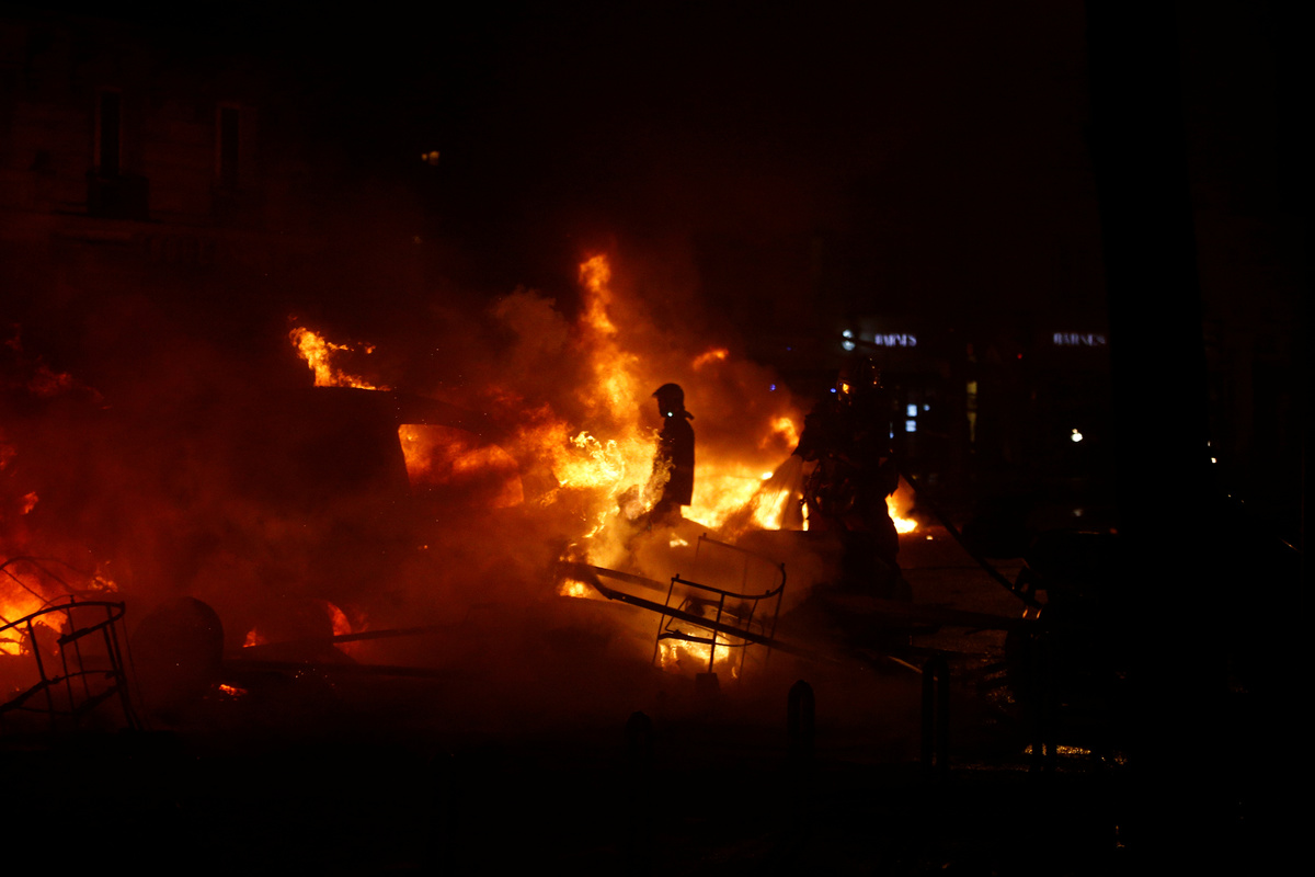 Close to the Place Vendome, Christmas trees decorating the streets were upended, piled in the middle of an avenue and set ablaze, prompting chanting from scores of protesters.