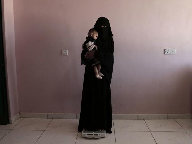 Mothers like Ms Mizrah are often the only defence against the hunger that has killed thousands. They go without meals, they sleep to escape the gnawing in their stomachs. They hide bony faces and emaciated bodies in voluminous black abaya robes and veils.