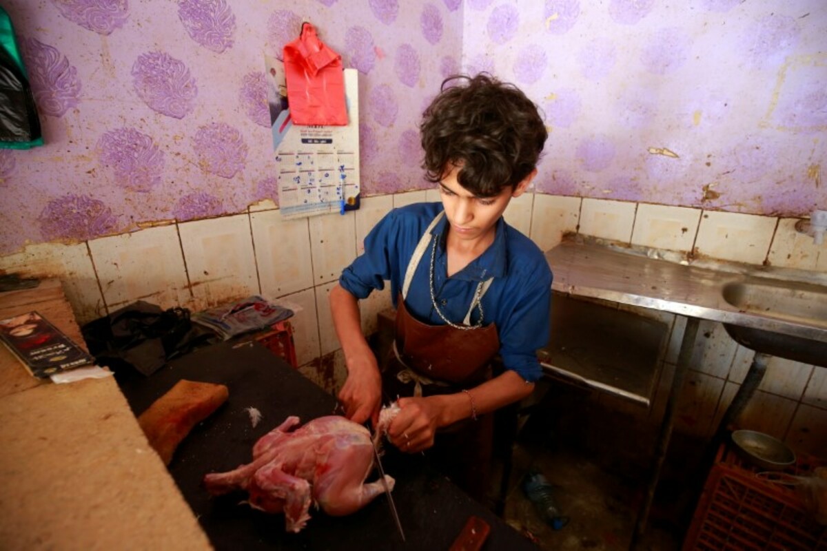 Instead of attending school, 15-year-old Harith Mansour spends his days wringing chickens' necks, plucking feathers and bagging up fresh meat for customers of a small shop in Yemen's capital Sanaa.