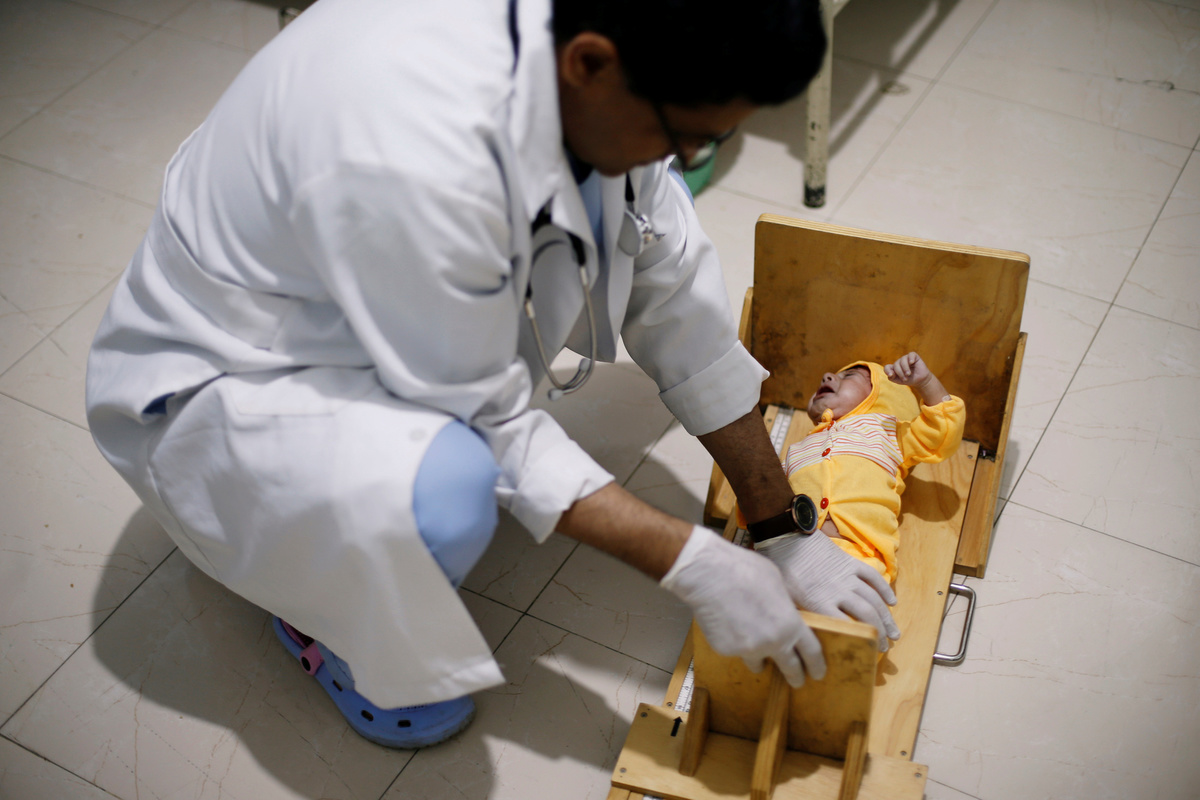 Pediatrician Mohammed Abdulmughni administers intravenous fluids to children in WHO tents in Sanaa. Their beds rest on gravel and flies circle their faces.