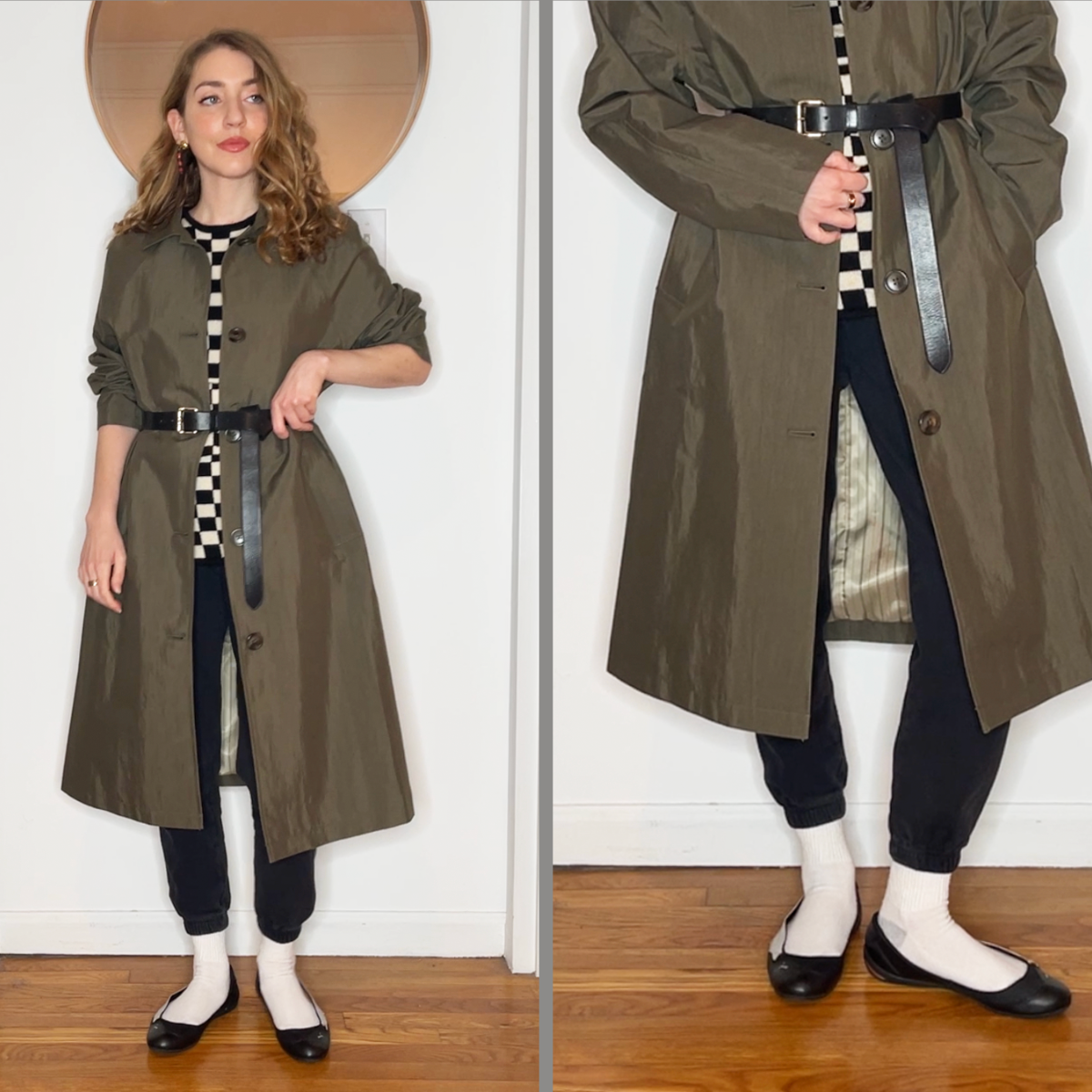 Next up, I belted the jacket so the hem would flare slightly, highlighting the puff of the sweatpants. I went sporty on the bottom (sweats and black flats) and more refined on top (a car coat and patterned knit). The inspiration: an Upper East Side woman meets an East Village student running errands. That’s kind of the point of shlubwear, no?