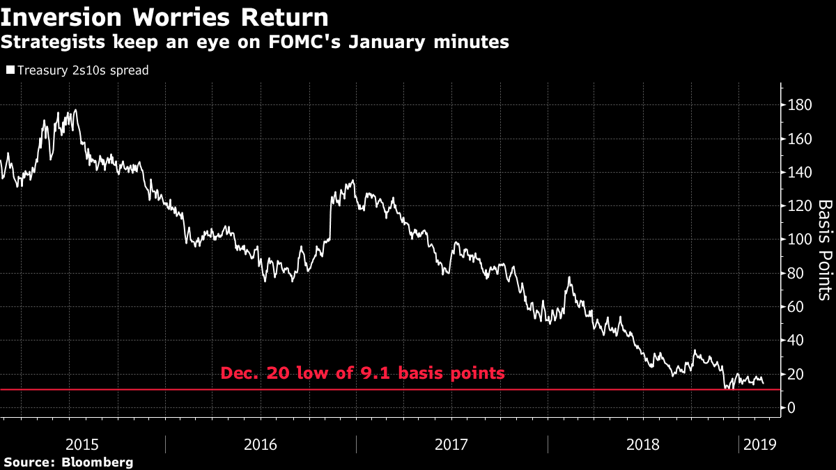 Wednesday’s release of minutes from the Federal Open Market Committee’s January meeting has the potential to send one of the most widely-followed parts of the Treasury yield curve hurtling toward inversion within a matter of weeks.
