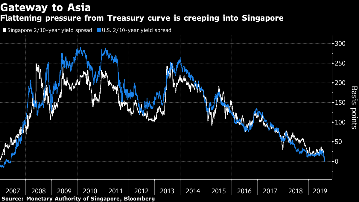 The spread between Singapore’s two- and 10-year yields narrowed to one basis point this week, the smallest gap since November 2006. Local interest rates and yields tend to follow those in the U.S. as the Monetary Authority of Singapore uses the currency rather than borrowing costs to set policy.