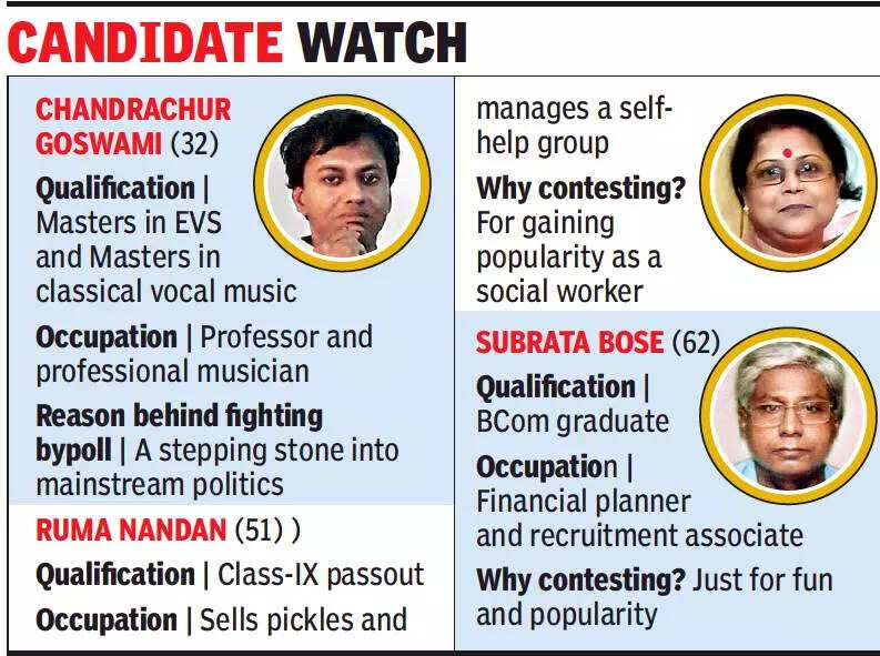 KOLKATA: A financial consultant, a yoga trainer, a school principal, a pickle seller, a stationary shop owner and a gold medallist classical musician are also in the poll fray at the Bhowanipore by-election this season which has 12 candidates — six of them being independents and three representing smaller parties other than CM Mamata Banerjee and the BJP and Left candidates.