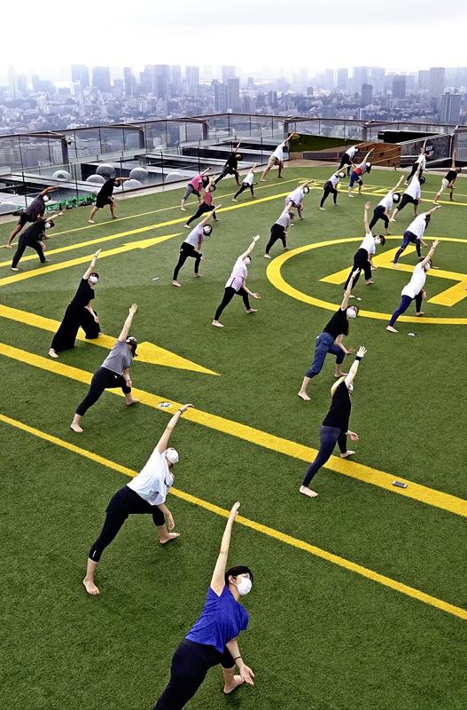 People practiced yoga on the roof of the 230-meter-high Shibuya Scramble Square in Shibuya Ward, Tokyo, on Wednesday morning.