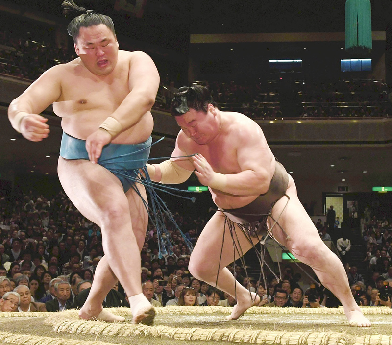 Sekiwake Tochinoshin (1-0) relied on sheer force, at one point lifting No. 2 maegashira Shohozan (0-1) off his feet before eventually forcing him out.