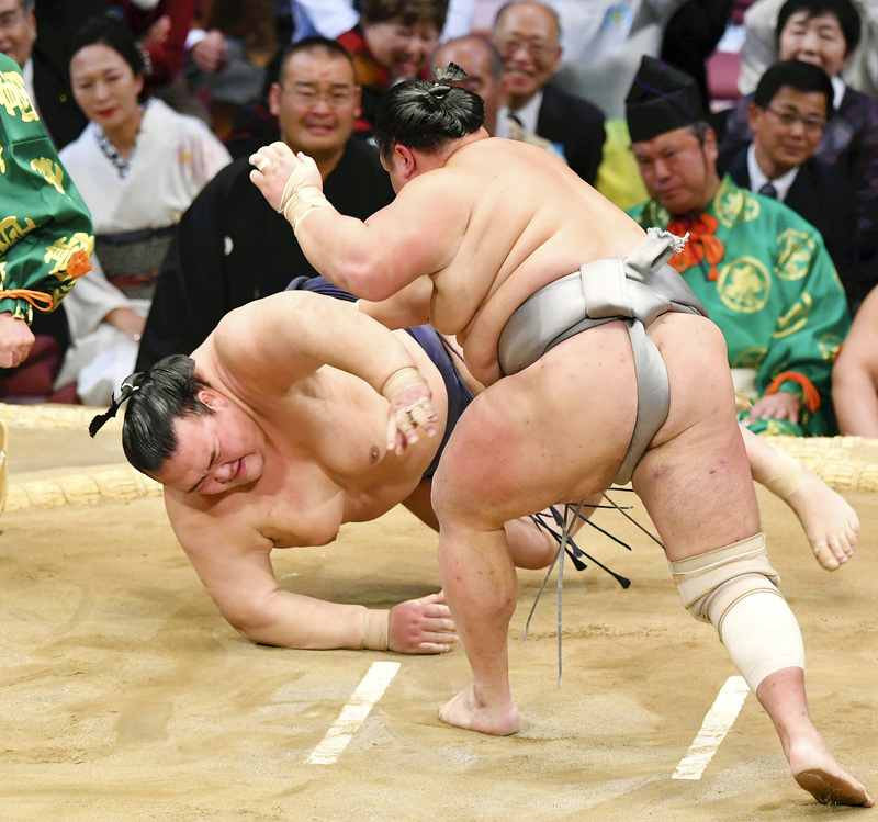 Ozeki Tochinoshin managed to pick up his second win by slapping down No. 1 maegashira Myogiryu (1-2).