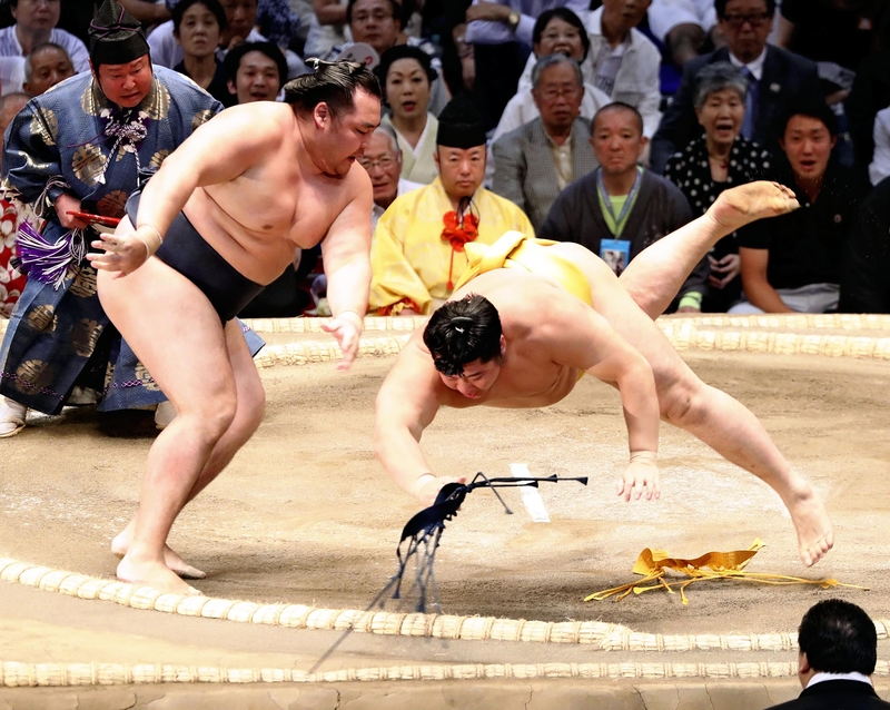 Meanwhile, No. 7 maegashira Tomokaze dropped from among the unbeaten as No. 5 maegashira Takarafuji (2-4) pulled him down.