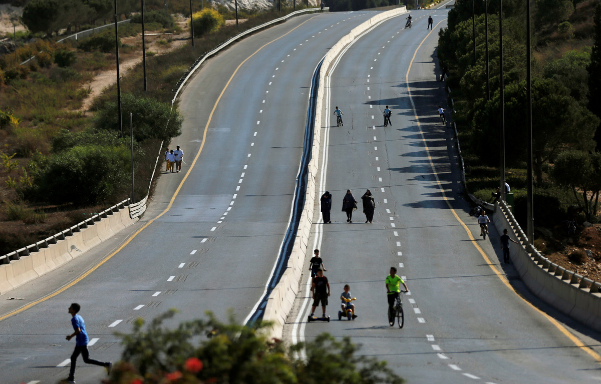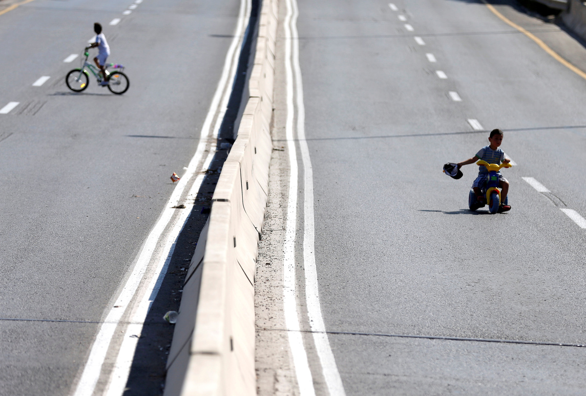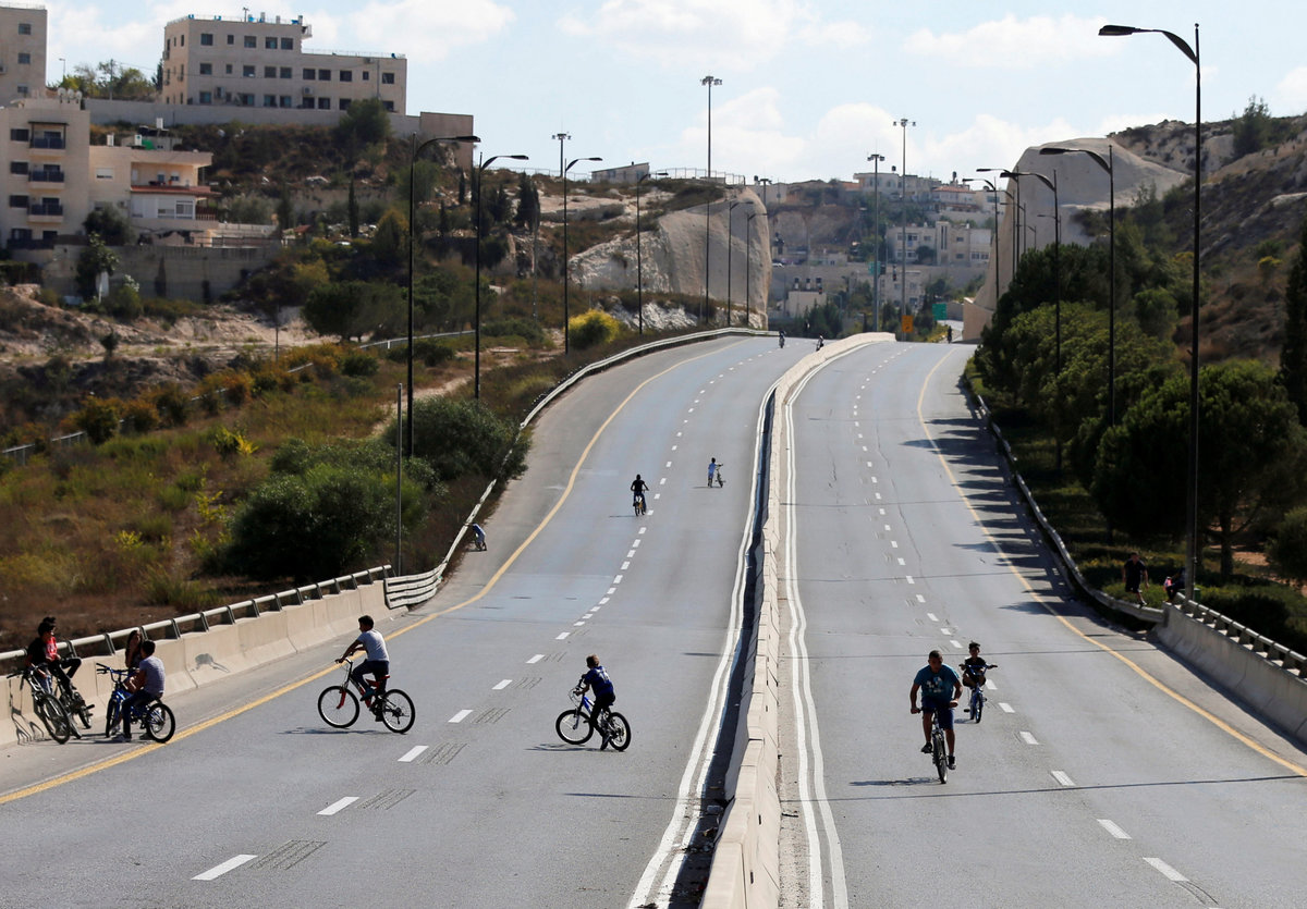 On Wednesday, scores of children went out to ride their bicycles, scooters and skateboards on a main road that separates the Israeli urban settlement of Pisgat Zeev from the Palestinian neighborhood of Beit Hanina, both in East Jerusalem.