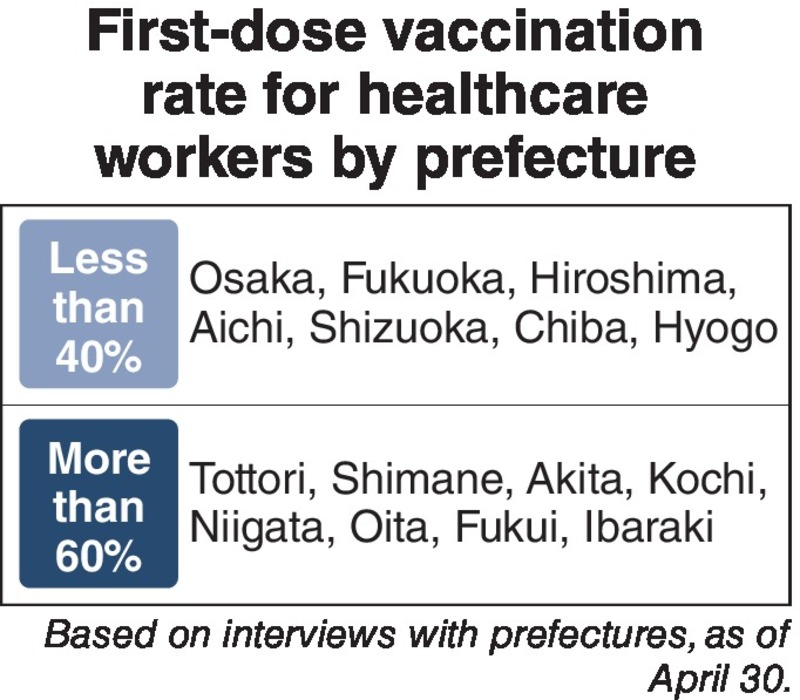A nationwide survey conducted by The Yomiuri Shimbun found that prefectures have encountered widespread delays in administering vaccines. As of April 30, the share of priority healthcare workers who had received their first shot ranged from a mere 31% to 62%, on a prefecture by prefecture basis.