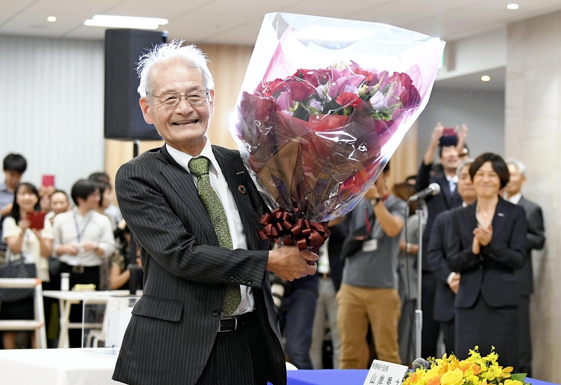 People shouted "Congratulations!" and applause continued for more than two minutes when Yoshino, 71, arrived at a press conference and received a bouquet of flowers shortly after 7:20 p.m. at Asahi Kasei's headquarters in Chiyoda Ward, Tokyo. He was dressed in a black suit and green tie.