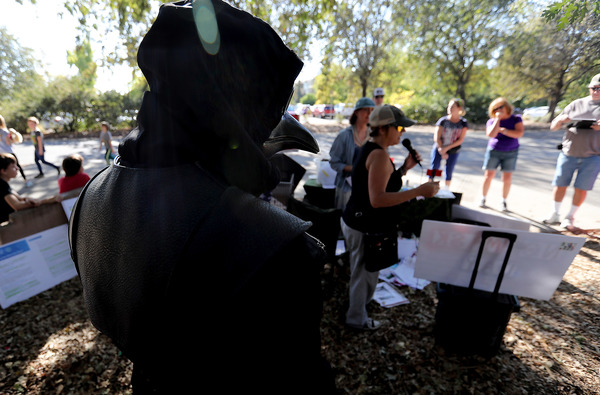 Back in Shasta County, a small group protesting coronavirus restrictions, mask mandates and vaccinations stood last week near Redding's Sundial Bridge. Among them was Robert Flynn, 30, who wore a homemade, 17th-century-style plague doctor mask with a bird-like beak.