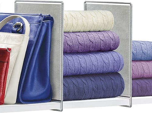 A closet shelf can be an invitation for clutter — but when strategically organized with these shelf dividers it becomes a tidy place to store sweaters, bags, and accessories. The dividers measure 12 inches tall, so they’re also a perfect height to stabilize and separate tall stacks. Just slide them onto the shelf and the sturdy wires will hold them in place.