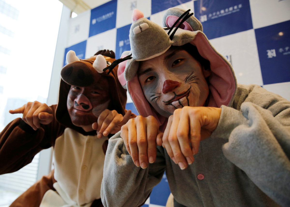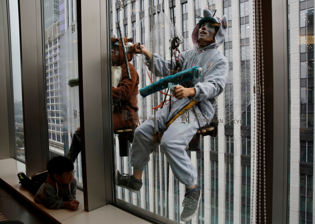 TOKYO (Reuters) - Dangling more than 50 meters above a busy Tokyo street, window cleaners dressed up as a boar and a rat on Thursday scrubbed windows at a downtown hotel ahead of the country's New Year festivities.