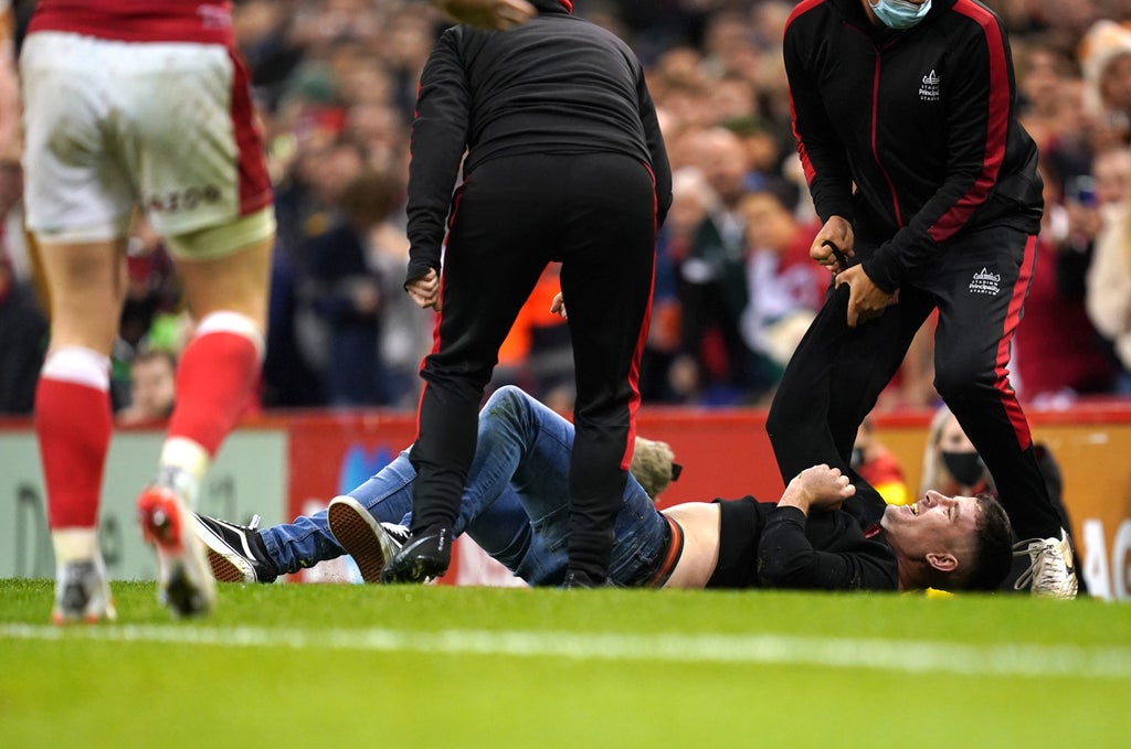 The hosts were attacking through substitute Liam Williams when the spectator ran onto the pitch only a few metres away from him and inside South Africa’s 22.