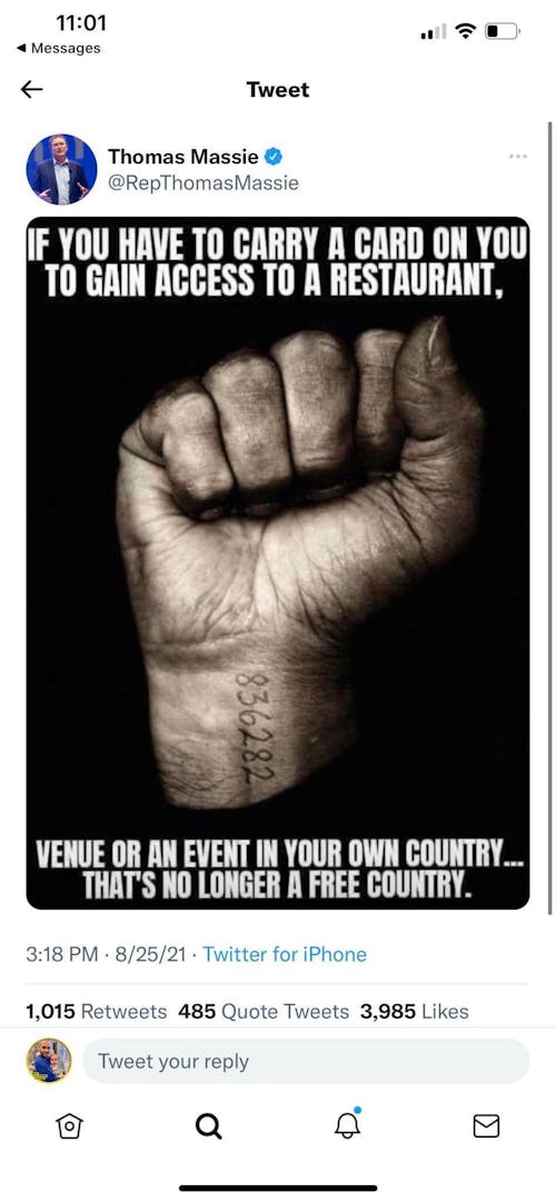 Where to even begin? How about the fact that Massie's tweet — featuring the infamous numbers tattooed by Nazi death camp officials onto prisoners — seems to ignore the fact that we've had to show cards to get into restaurants, venues, and events in this country for decades. Has Massie never tried to order a drink at a bar? Or enrolled children in public school? Or boarded a plane? All of these are extremely benign, commonplace activities which — surprise surprise! — necessitate showing some sort of documentation.