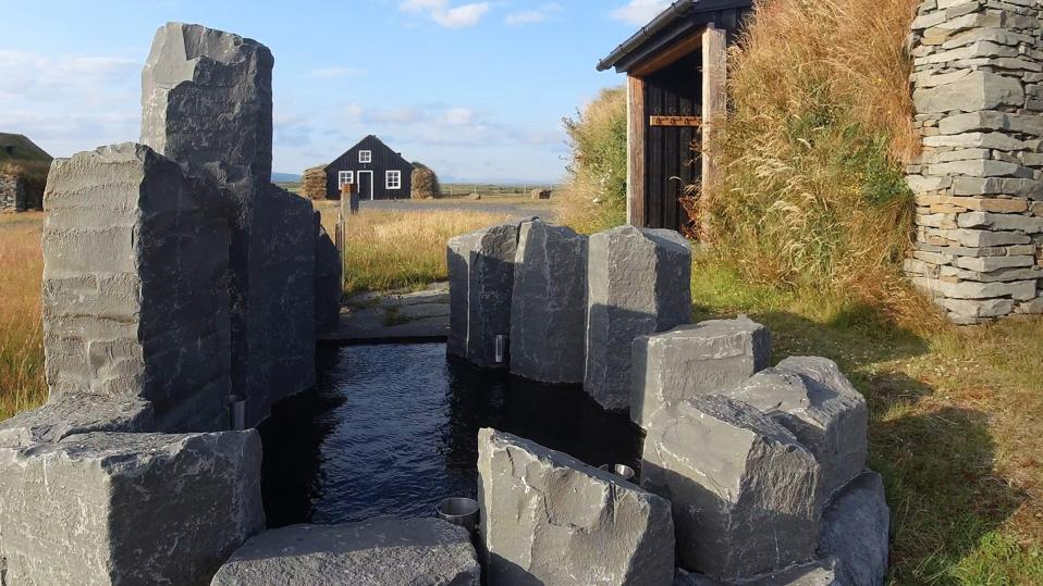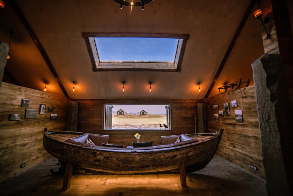 The overall tone here, apart from remoteness, is sustainability, authenticity, high quality but in a rustic, relaxed style. The traditional architecture in the 10 two bedroom, 646 square foot Torfhús houses and the 15 one bedroom, 312 square foot Torfbaer suites is inspired by Viking styles and constructed of local stone, turf and reclaimed oak and pine for the interior floors, walls, bedframes and (in the Torfhús houses) cabinets in the full kitchens. The furniture is also vintage, handcrafted and rustic as well but in a nod to modern times, there are Smart TVs, state of the art WiFi and Nespresso machines. And each house has a trademark Icelandic feature: geothermal basalt stone pools for soaking. The Torfhús houses have their own private pools, the Torfbaer suites share one between the three suites within each house.