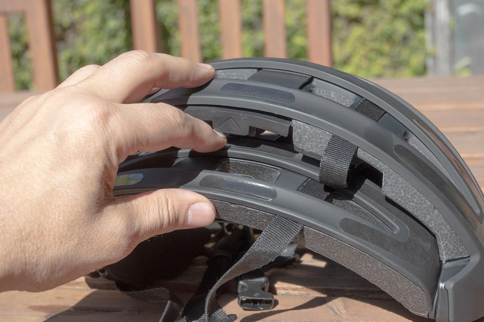 So first things first: If you’ve never seen a foldable bike helmet, this bears some explaining. There are a handful of helmets on the market that fold up or otherwise collapse like some sort of origami headgear, and that makes them more convenient to carry around when dismounting from your bike. The FEND manages to halve its size with one flick of your hand by tucking the sides up and under the top of the helmet.