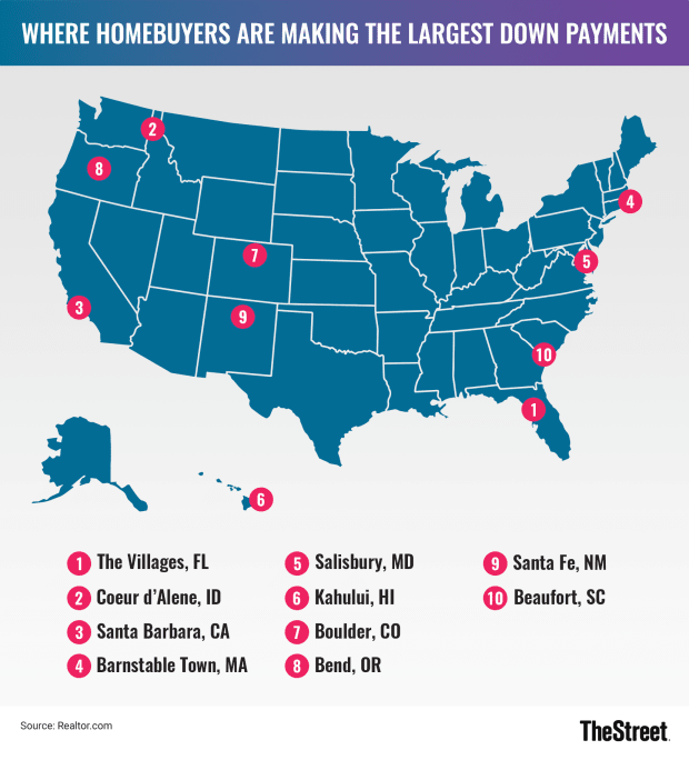 A Florida city developed specifically for those older than 55, The Villages took top spot but should not be used to draw conclusions about the rest of the country -- the 30.2% down payment average reflects the large number of new retirees who are buying with the proceeds from a house in another part of the country.