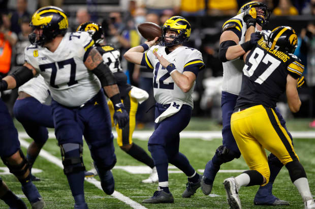 Saturday night, after Michigan beat Iowa to win the Big Ten, McNamara saw his parents. He talked a little about a completion he threw to tight end Luke Schoonmaker, and a lot more about everything that went wrong on his lone interception. Michigan had won the game 42–3, but let’s keep that between us.