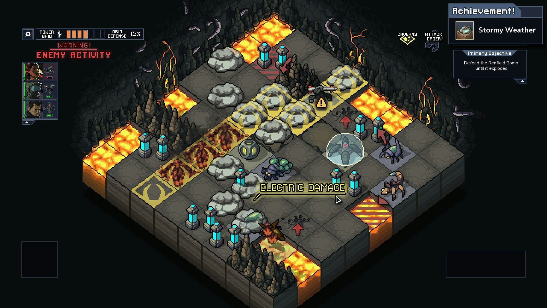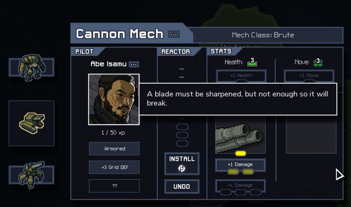 There are 27 mechs grouped into nine, three-member squads. The relationship between mechs is another standout design decision. While there are technically classes of mech across each group, all the abilities are slightly different and complement each another in unique ways. Some squads focus on tossing enemies around the battlefield so that their attacks hit each other. Others involve fire or freezing or electricity. A modest shop mechanic at the end of each level lets you customize your squad with new weapons and abilities, too.