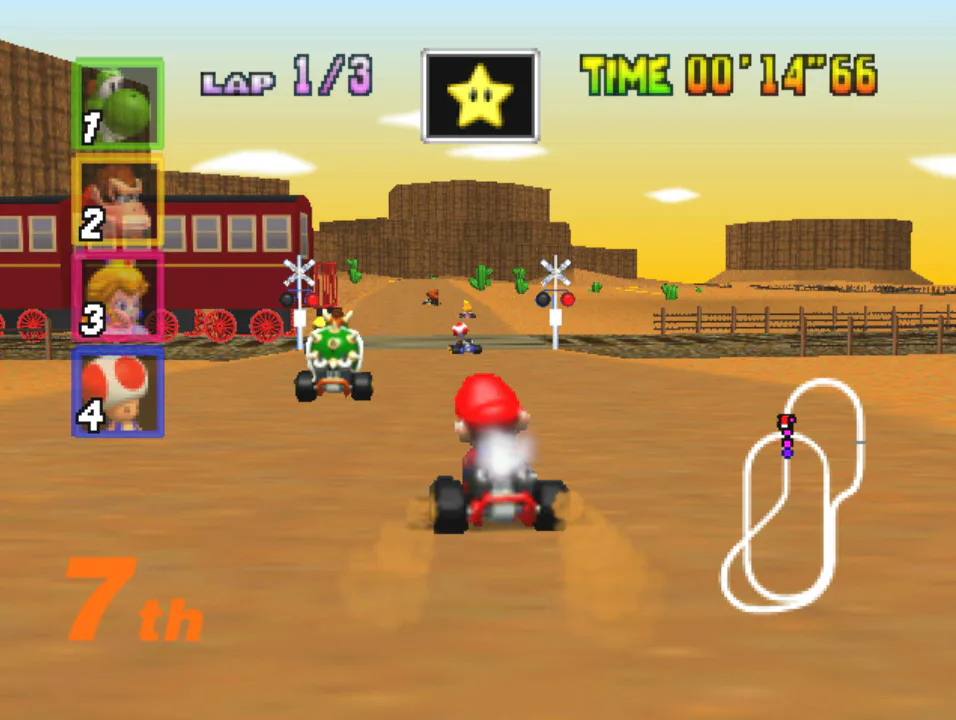 Another once marvelous, now humdrum aspect of Mario Kart 64 is its interactive levels. Watching the train drive through the Kalimari desert was once astonishing, but it might not have that same magic. Several levels now feel noteworthy for their wide amount of empty space.