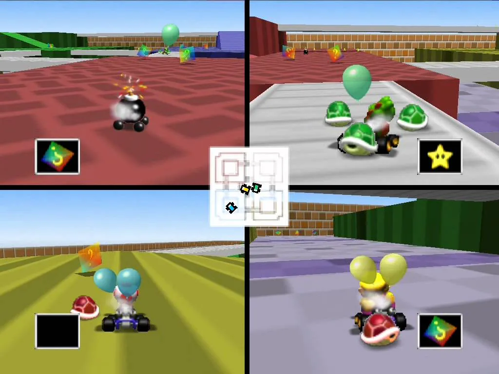 Breaking the screen into four blocks, Miyamoto described the mode like “playing on 4 separate little TVs,” crediting the N64’s CPU with the ability to run four perspectives simultaneously. There’s not just multiplayer racing in Mario Kart 64, after all.